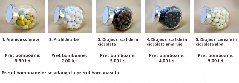 ATENTIE! Bomboanele nu sunt incluse in pretul marturiei. Acestea se pot adauga in comanda, iar pretul lor difera in functie de tipul bomboanelor (puteti vizualiza tipurile de bomboane si preturile in galeria foto a produsului). Daca doriti si bomboane va rugam sa specificati acest lucru in campul "Observatii comanda".