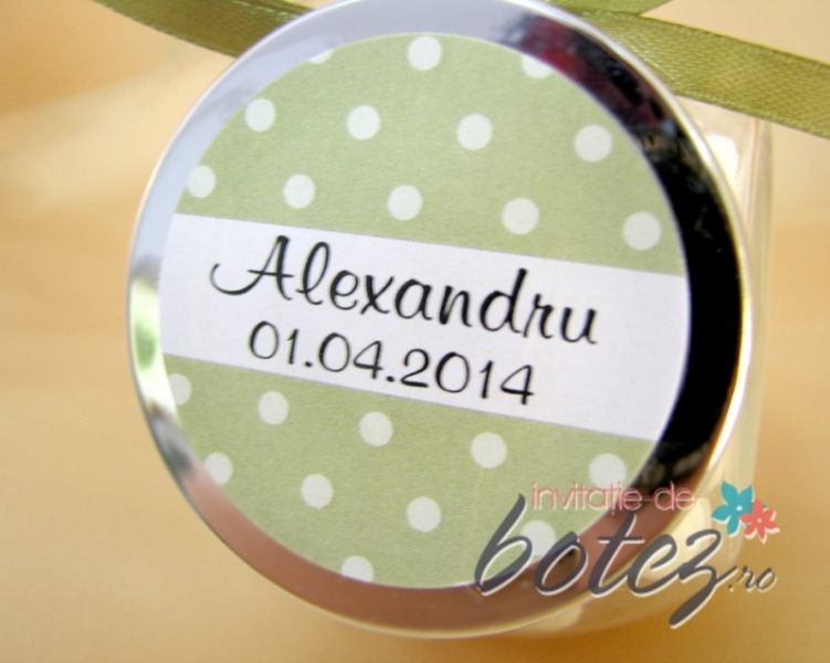 Marturie de botez borcanas cu bomboane, accesorizat cu o fundita satinata de culoare verde olive cu perluta alba. Capacul este in aceeasi nuanta a funditei si are ilustrate buline albe. Capacul se poate personaliza cu numele copilului si data botezului.