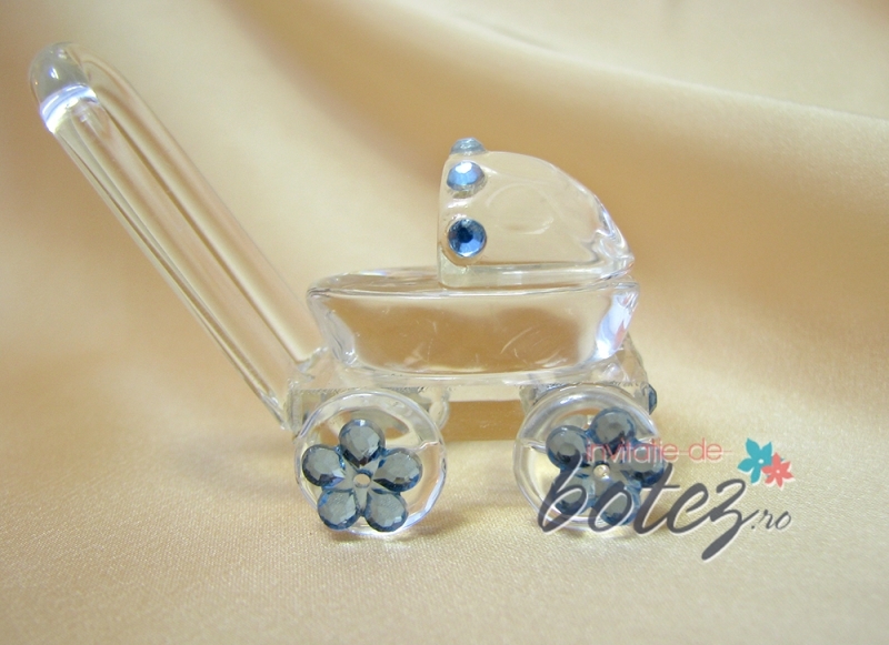 Marturie de botez carucior din sticla cu ornamente bleu