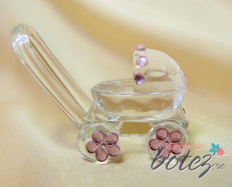Marturie pentru botez carucior din sticla cu floricele si puncte roz.