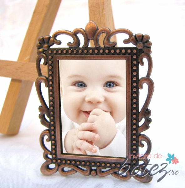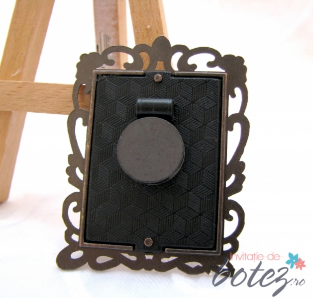 Marturie de botez rama foto cu model floral, din metal, cu magnet atasat pe spate. Aceasta micuta rama foto se poate pune pe orice suprafata metalica, fiind un frumos suvenir pentru invitati.