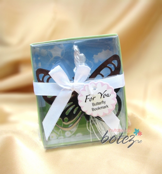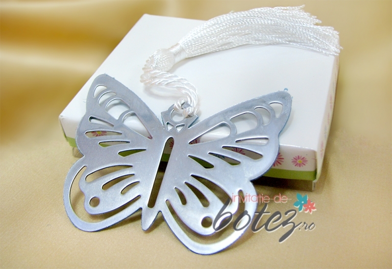 Marturie de nunta semn de carte, in forma de fluturas metalic, ce are atasat un ciucure din satin alb.