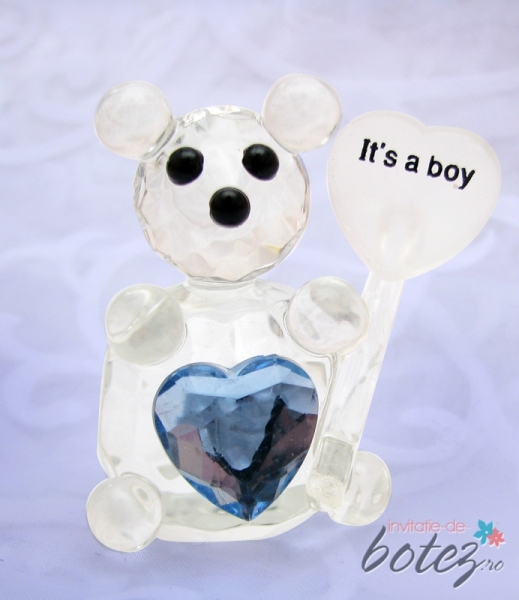 Marturie de botez in forma de ursulet din sticla, cu inimioara albastra si semn pe care este inscriptionat textul "It's a boy!"