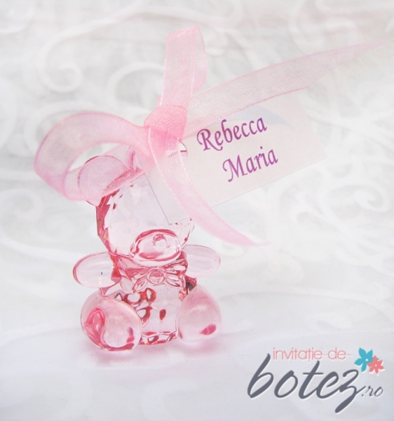 Marturie de botez in forma de ursulet din plastic dur, de culoare roz, ce are atasata o fundita din organza de aceeasi culoare. Aceasta marturie este potrivita pentru botezul unei fetite.
