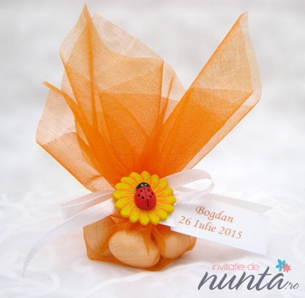 Marturie de botez, in forma de punguta, umpluta cu bomboane. Punguta din tul portocaliu este accesorizata cu o fundita din satin de culoare alba si un accesoriu in forma de floarea soarelui cu buburuza.