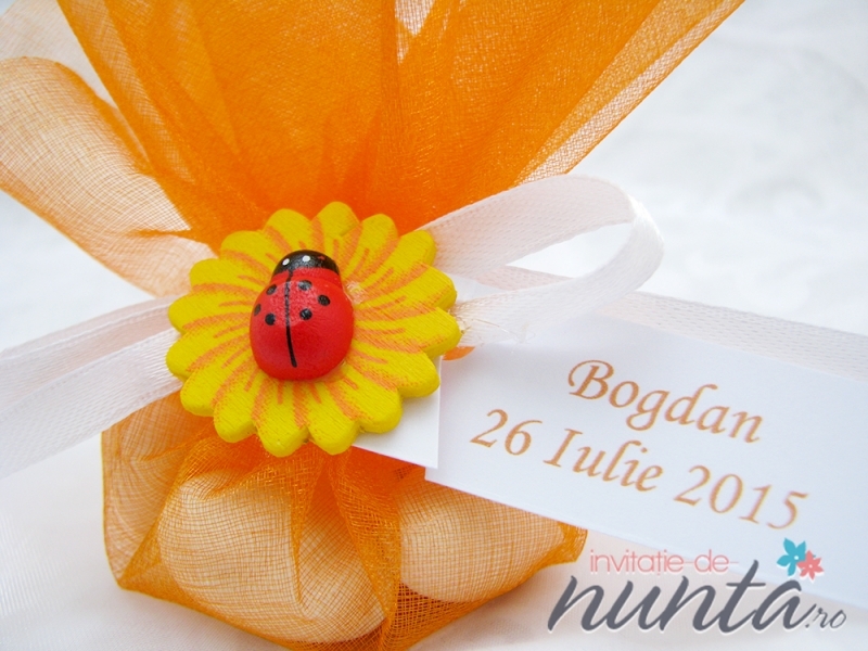 Marturie punguta cu bomboane cu floarea soarelui si buburuza