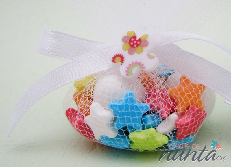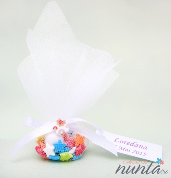 Marturie in forma de punguta umbluta cu bomboane colorate. Punguta din tul alb este accesorizata cu o fundita alba din satin si o floricica.