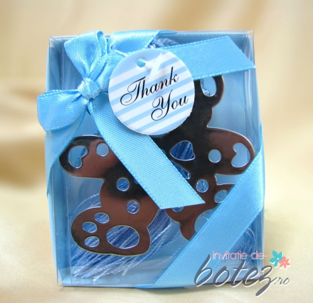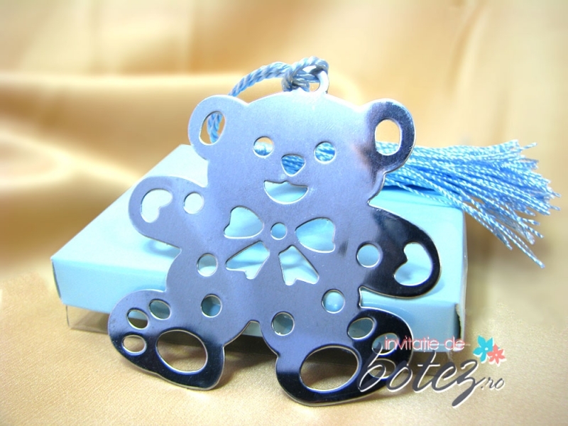 Marturie de nunta semn de carte, in forma de ursulet metalic, ce are atasat un ciucure din satin bleu.