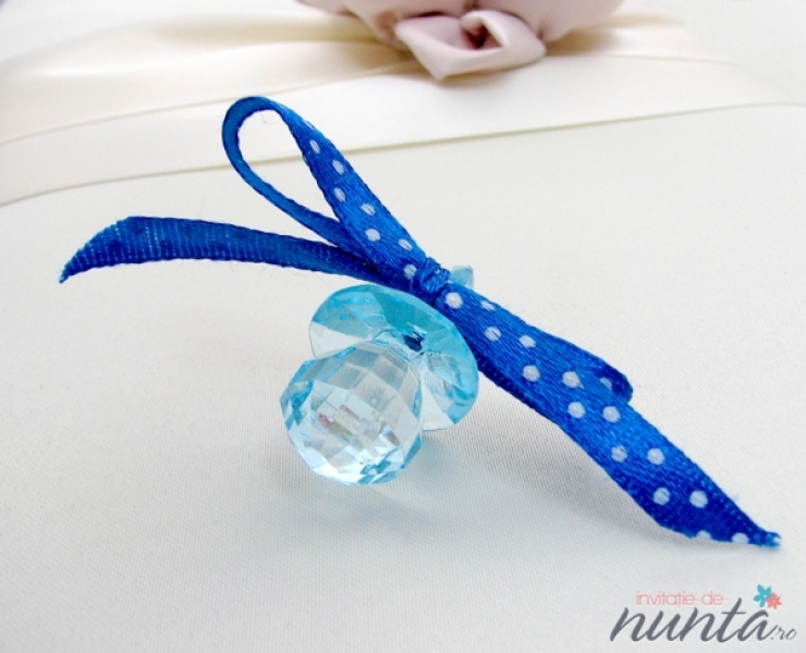 O mica suzeta din plastic bleu, accesorizata cu o fundita din panglica albastra de saten cu buline. Aceasta marturie gingasa este perfecta pentru botezul unui baietel.