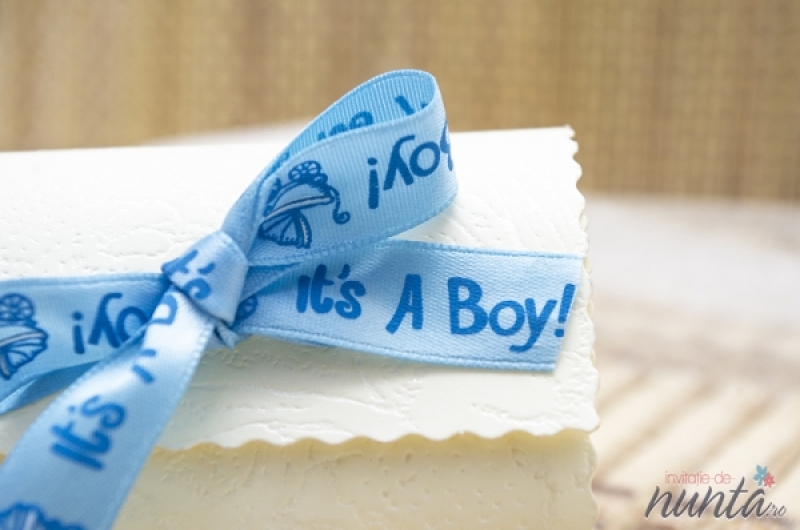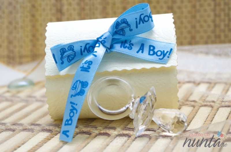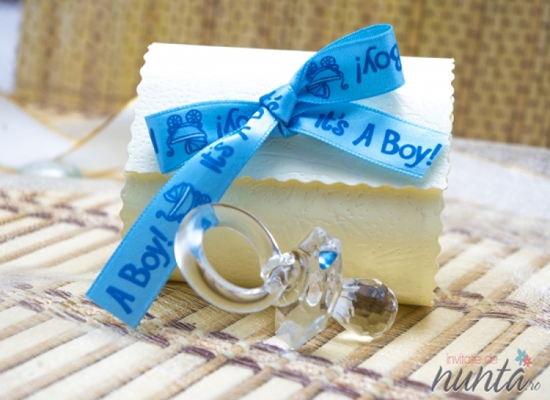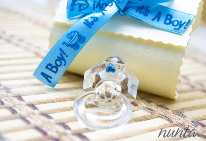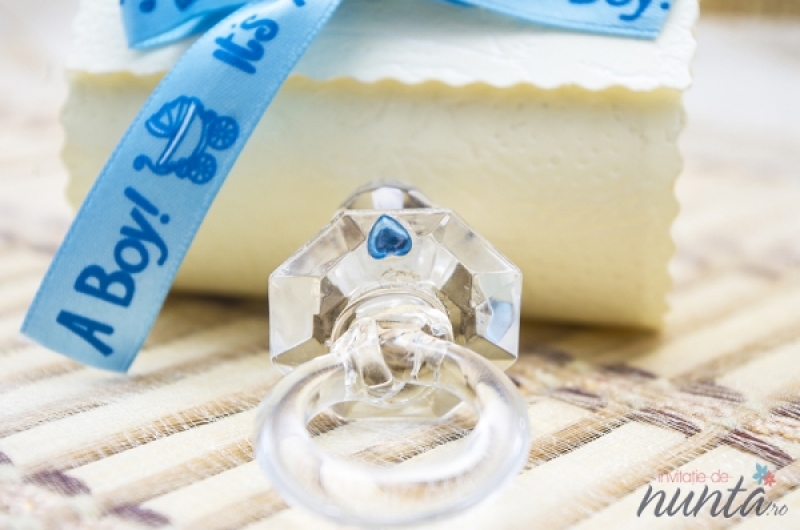 Marturie de botez in forma de suzeta transparenta, ce vine impreuna cu o cutiuta speciala crem cu fundita bleu. Panglica are inscrptionat textul "It's a boy!". Aceasta marturie este perfecta pentru botezul unui baietel.
