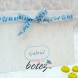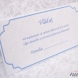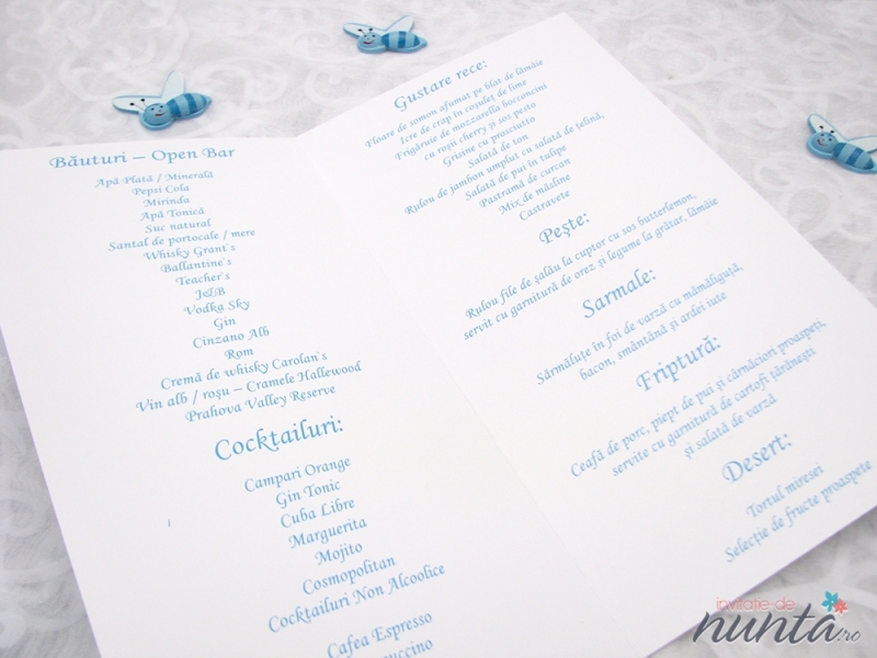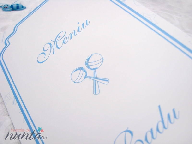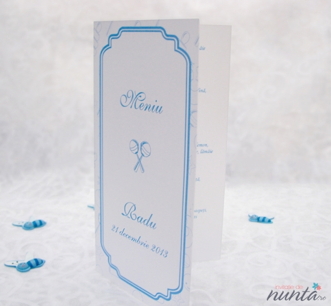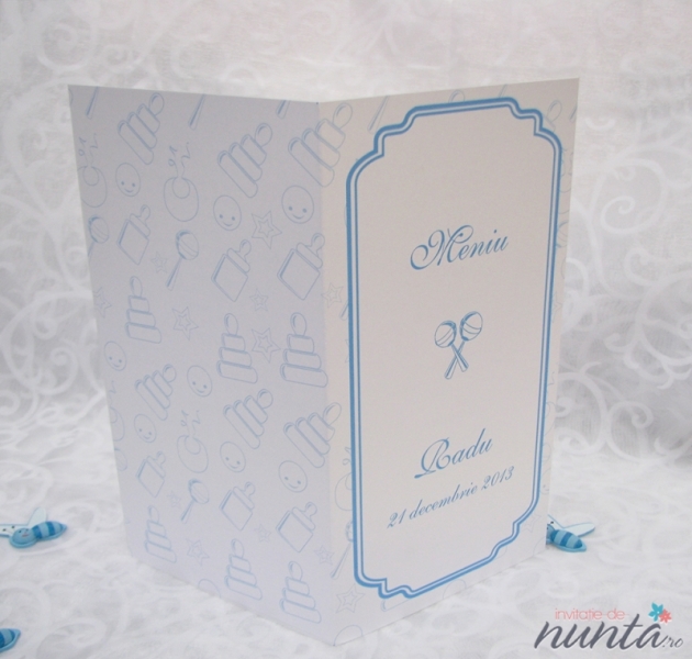 Meniu din carton alb, mat, ce are pe fundal numeroase ilustratii conturate cu albastru. Pe partea din fata este un chenar albastru, in care se scriu numele copilului, data nasterii si cuvantul "Meniu".