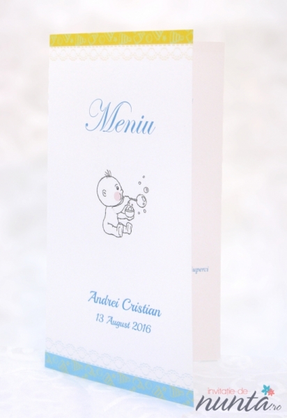 Meniu din carton alb, mat, cu borduri galbena si bleu. Pe partea din fata este ilustrat un bebelus, data nasterii si cuvantul "Meniu".