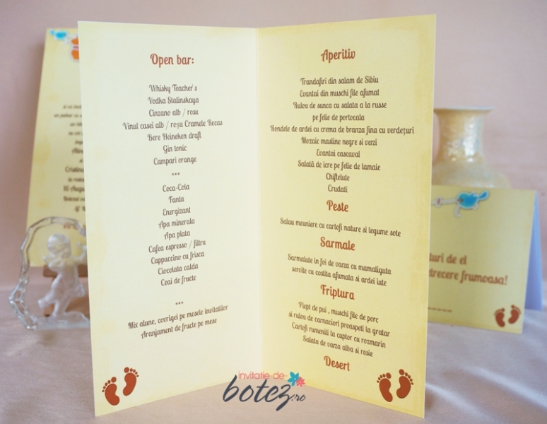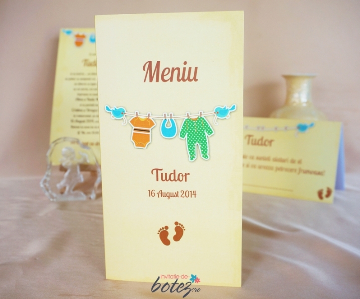 Meniu de botez cu pasarele si hainute, este facut din carton alb, mat, pe care este imprimat un fundal galben interior-exterior iar in partea superioara a meniului sunt atarnate de o ata hainute de bebelus tinute de doua pasarele. Pe partea exterioara sunt trecute numele bebelusului si data botezului. Textul se imprima in interiorul meniului. Meniul este potrivit pentru botezul unui baietel.