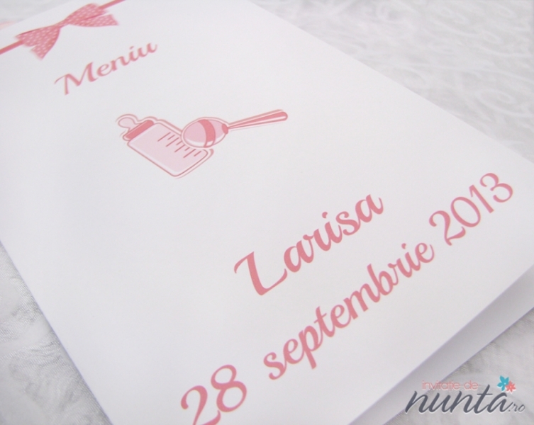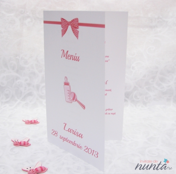 Meniu de botez din carton alb, mat, ce are ilustrate un biberon, o jucarie si o fundita roz cu buline. Pe exterior se tiparesc numele copilului, data nasterii si cuvantul "Meniu".