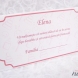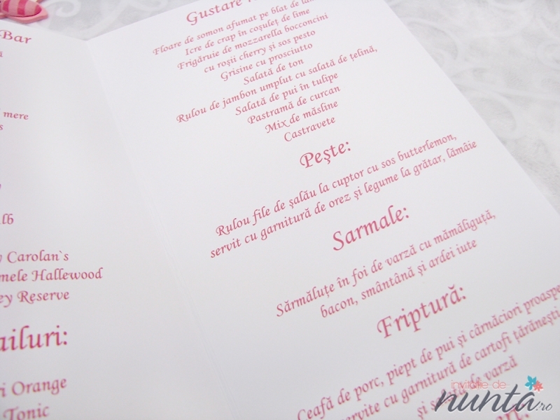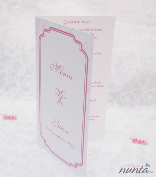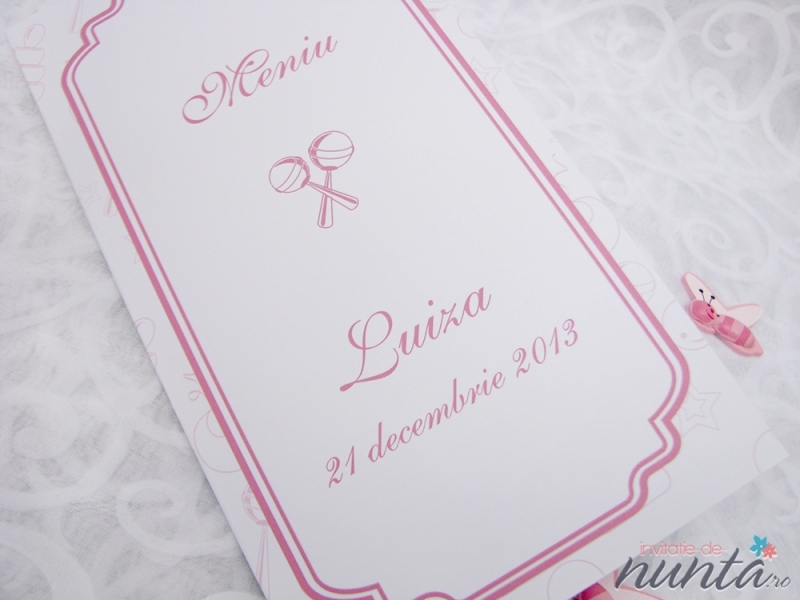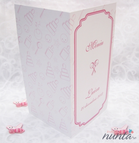 Meniu din carton alb, mat, ce are pe fundal numeroase ilustratii conturate cu roz. Pe partea din fata este un chenar roz, in care se scriu numele copilului, data nasterii si cuvantul "Meniu".