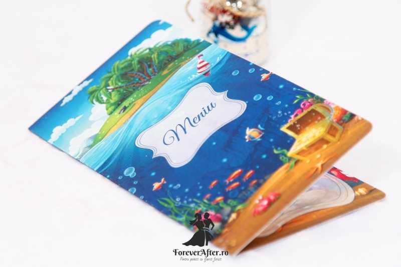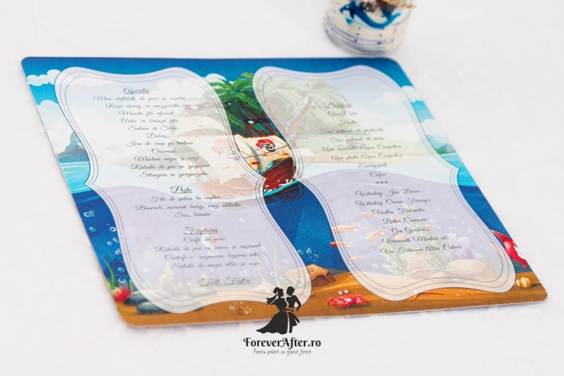 Meniu de culoare albastra care completeaza perfect tema marina a botezului bebelusului vostru. Pe fata si in interiorul acestuia sunt redate scene din viata subacvatica, dar si ceea ce se intampla deasupra apei: piratii care se aventureaza in ape nelinistite pentru a gasi imensele comori. Meniul se pliaza pe verticala,iar textul se tipareste in interior.