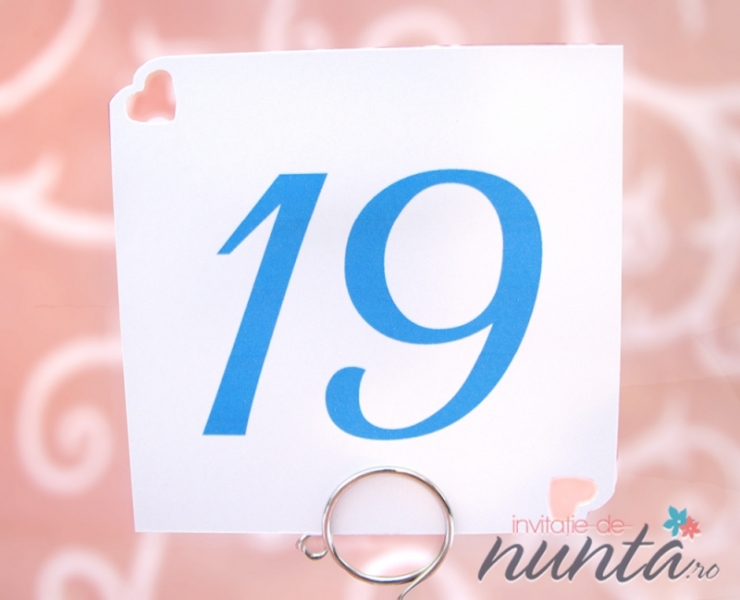 Numar de masa din carton alb, mat, cu colturi perforate in forma de inimioare. Pe acest card se pot imprima numerele meselor, folosind orice tip de text si orice culoare doriti.