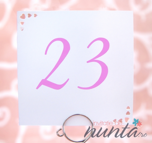 Numar de masa din carton alb, mat, cu colturi perforate in forma de inimioare. Pe acest card se pot imprima numerele meselor, folosind orice tip de text si orice culoare doriti.