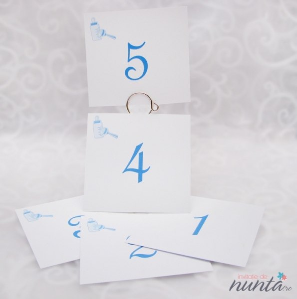 Numar de masa din carton alb, mat, ce are ilustrate un biberon si o jucarie conturate cu albastru. Pe acest card se pot imprima numerele meselor, folosind orice tip de text si orice culoare doriti.