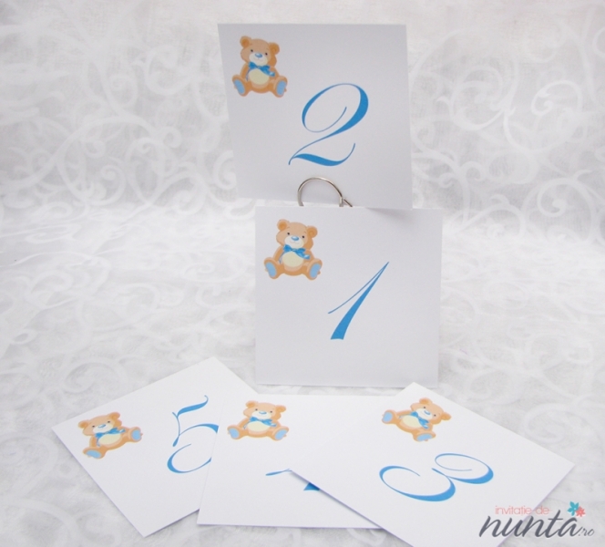 Numar de masa din carton alb, mat, cu ilustratia unui ursulet albastru. Pe acest card se pot imprima numerele meselor, folosind orice tip de text si orice culoare doriti.