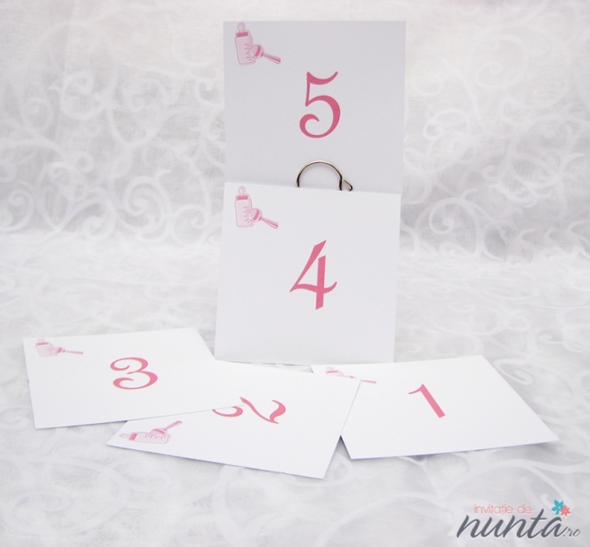 Numar de masa din carton alb, mat, ce are ilustrate un biberon si o jucarie conturate cu roz. Pe acest card se pot imprima numerele meselor, folosind orice tip de text si orice culoare doriti.