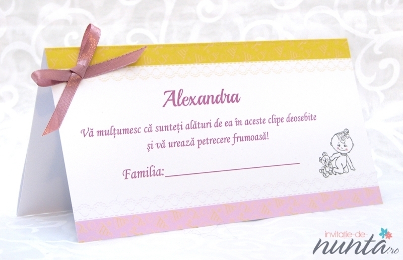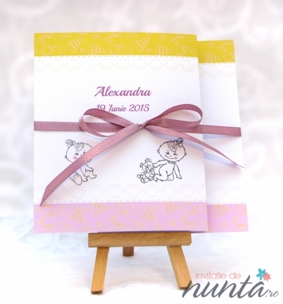 Invitatia de botez este din carton alb, mat, cu borduri galbena si roz si bebelusi haiosi. Invitatia se pliaza in stil evantai si se prinde cu o fundita din satin galbena. Pe coperta sunt ilustrati doi bebelusi si numele copilului si data botezului.