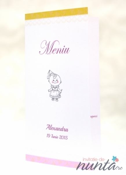 Meniu din carton alb, mat, cu borduri galbena si roz. Pe partea din fata este ilustrat un bebelus, data nasterii si cuvantul "Meniu".