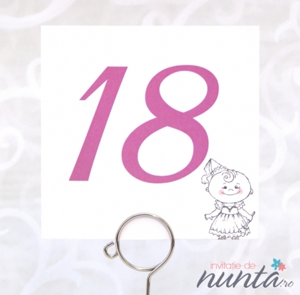 Numar de masa este din carton alb, mat, ce are ilustrat un bebelus. Pe acest card se pot imprima numerele meselor, folosind orice tip de text si orice culoare doriti. Personalizarea este inclusa in pret.
