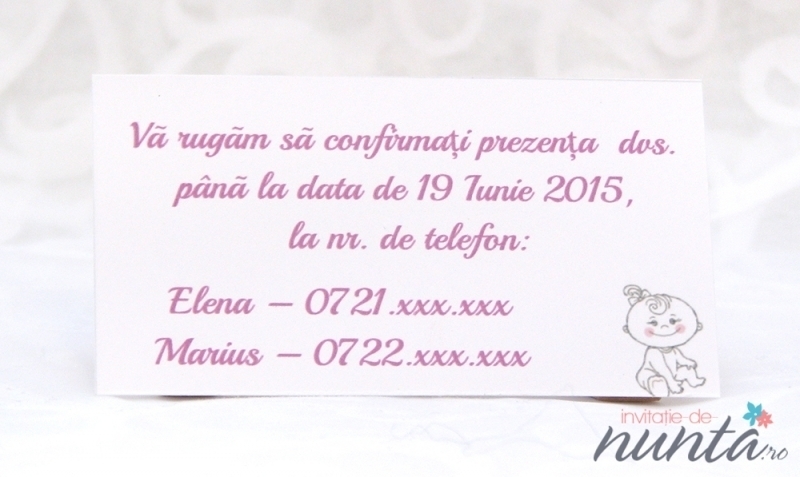 Card de confirmare ce va insoti invitatia dumneavoastra. Cardul este confectionat din carton alb, mat si are ilustrat un bebelus haios. Va puteti alege orice font si orice culoare pentru tiparirea textului. Personalizarea este inclusa in pret.