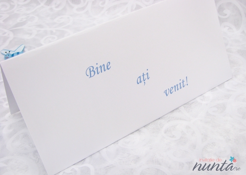 Plic de bani din carton alb, pliat pe verticala cu chenar, fundita albastra si bebelus. Plicul poate fi folosit si pe post de card de masa.