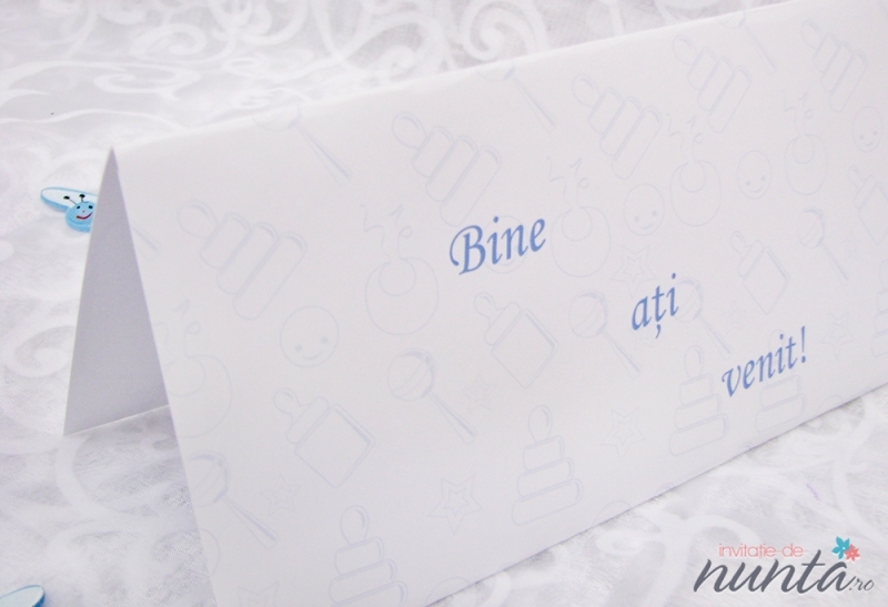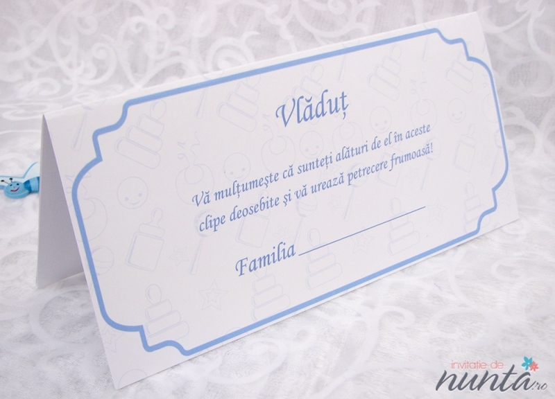 Plic de bani din carton alb, pliat pe verticala, ce are ca fundal numeroase jucarii conturate cu albastru. Pe partea din fata se afla un chenar in care se tipareste textul. Plicul poate fi folosit si pe post de card de masa.