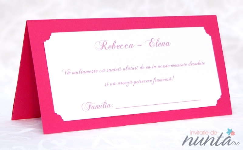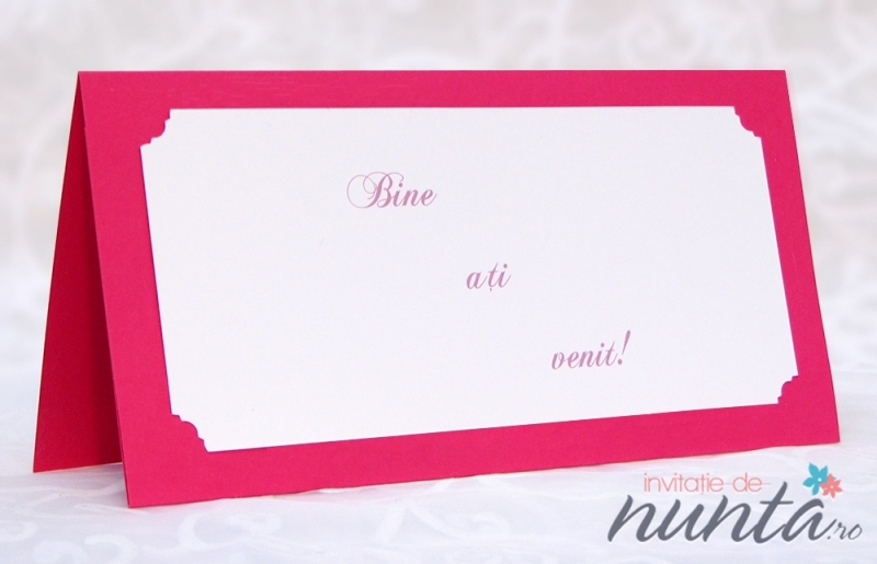 Plic de bani din carton roz, cu chenar si inimioare, pliat pe verticala. Plicul poate fi folosit si pe post de card de masa.