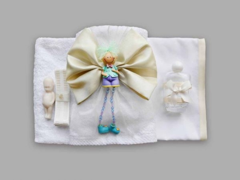 Un trusou haios, cu funda satinata crem si figurina baietel, ideal pentru botezul baieteilor.