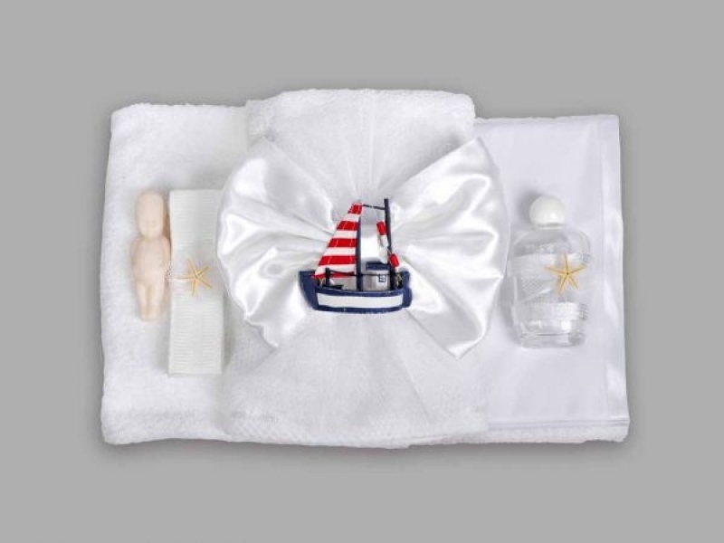 Trusoul pentru botez cu tema marina, are ca acesorii o fundita alba si o barcuta, fiind ideal pentru botezul baieteilor.